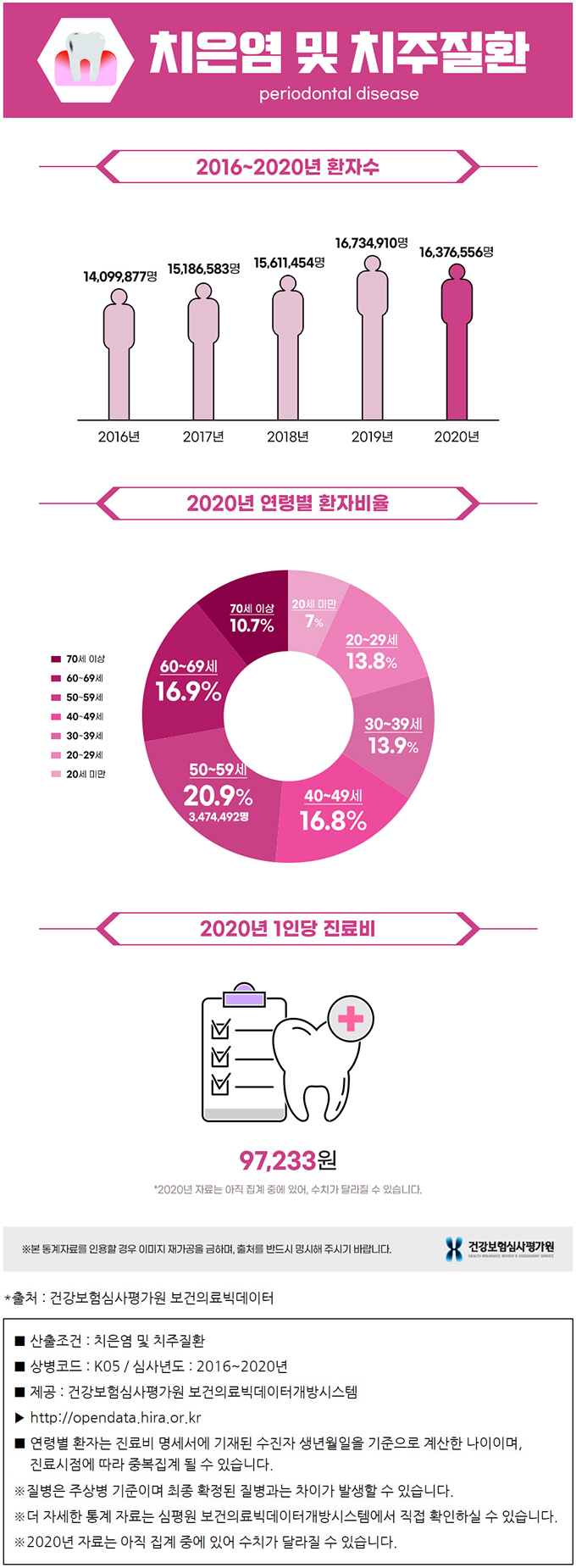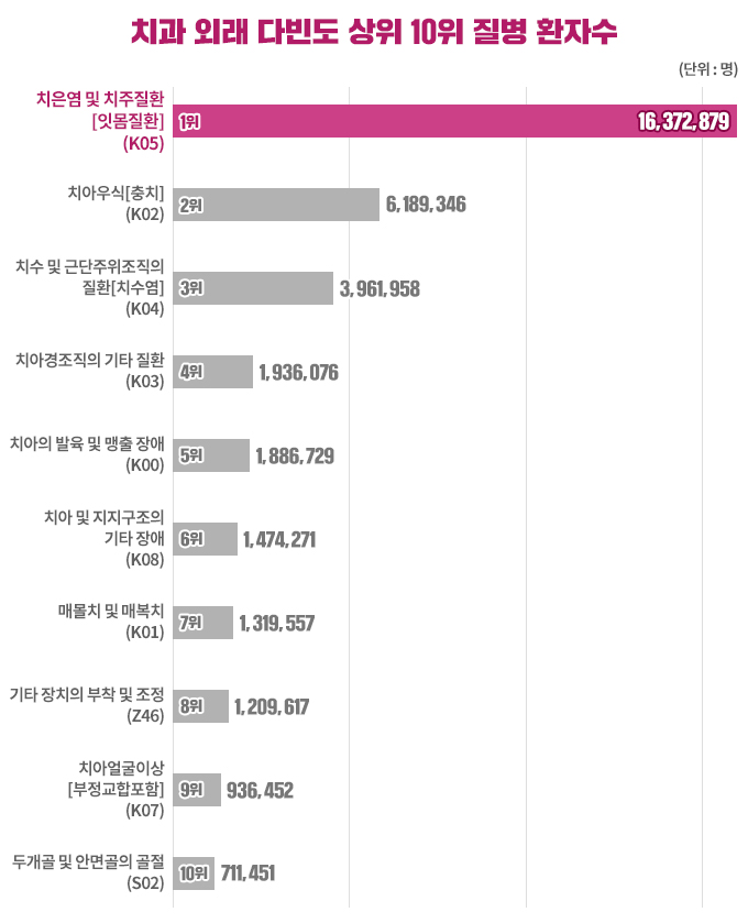 이번 주부터 2020년 한 해 동안 치과 외래 진료가 많았던 질병을 소개해드리고자 하는데요. 오늘은 치과 외래 진료에서 압도적으로 많은 환자수를 차지한 치은염 및 치주질환에 대해 알아보겠습니다.