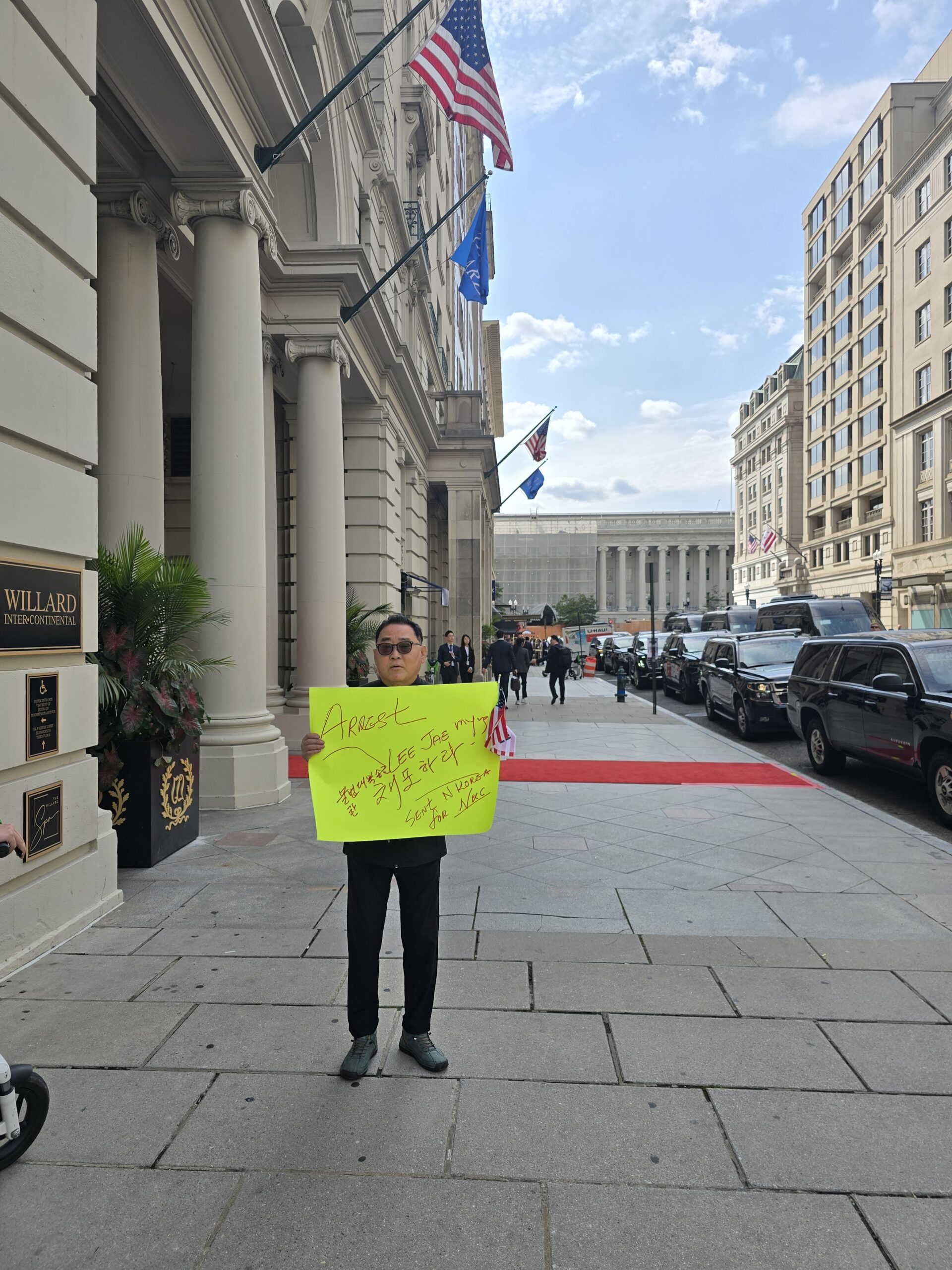 한편 행사장 밖에서는 이재명 대통령의 호텔 도착 시간에 맞춰 ‘반(反) 이재명 단체’의 시위가 동시다발적으로 있었다. 제임스 대니얼 신 목사는 ‘이재명 체포’라고 적힌 피켓을 들고 시위를 벌였고, 몇몇 보수단체에서는 동포간담회 호텔앞에서 요란하게 시위를 벌여 경찰의 제지를 받기도 했다.