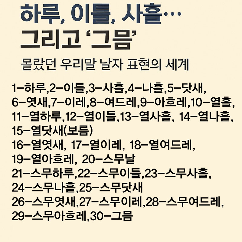 예를 들어 “여행을 사흘 갔다 왔다”는 말은 3일 동안 다녀왔다는 의미이고, “보름간 금식을 했다”는 표현은 정확히 15일 동안이라는 뜻이다. 이처럼 우리말은 숫자에 기반한 단순한 표기가 아니라, 각 날짜마다 풍부한 어감과 정서를 담은 고유어가 존재한다.