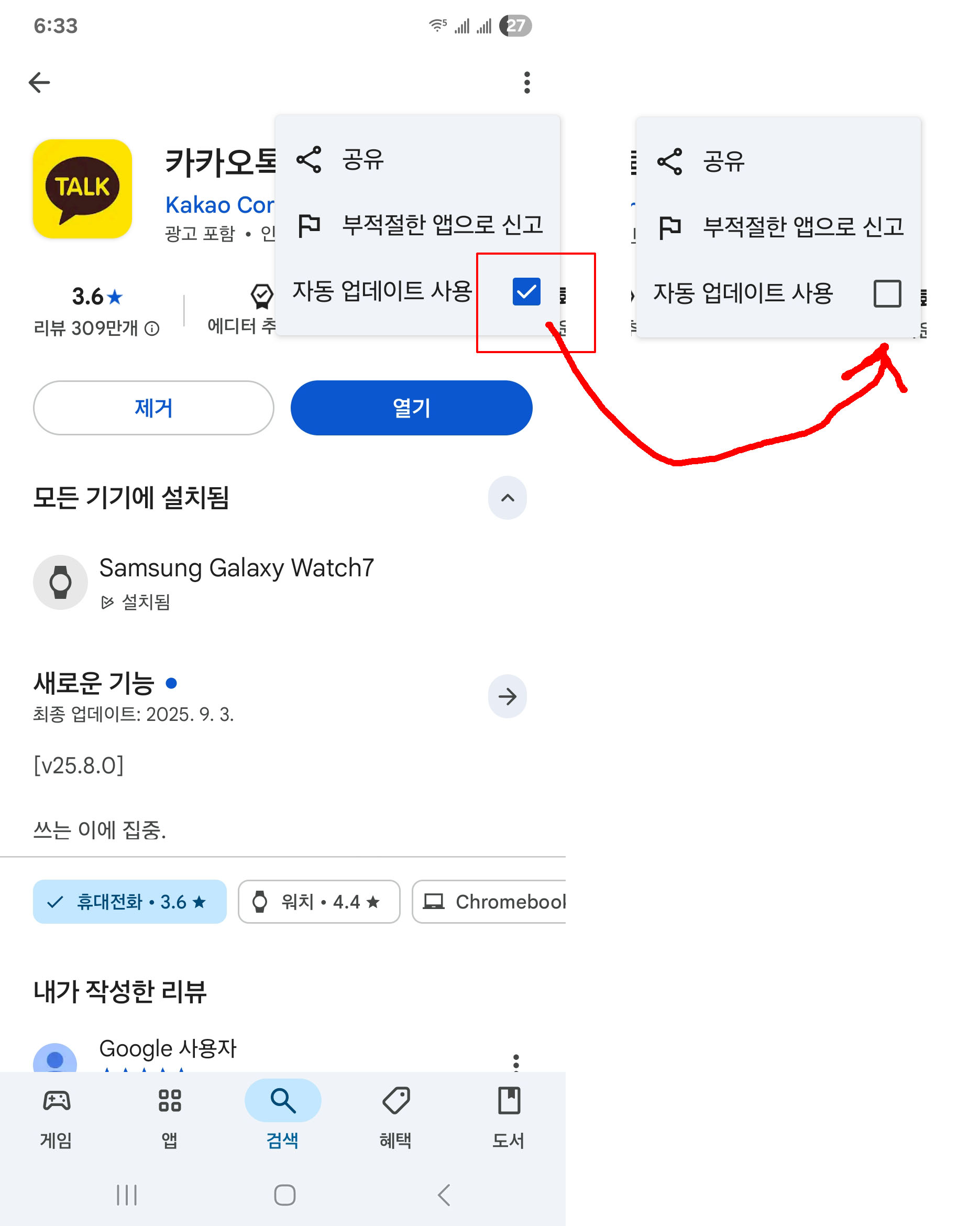 안드로이드: 구글 플레이스토어에서 카카오톡 앱 상세 페이지 → 우측 상단 메뉴 → ‘자동 업데이트 사용’ 해제