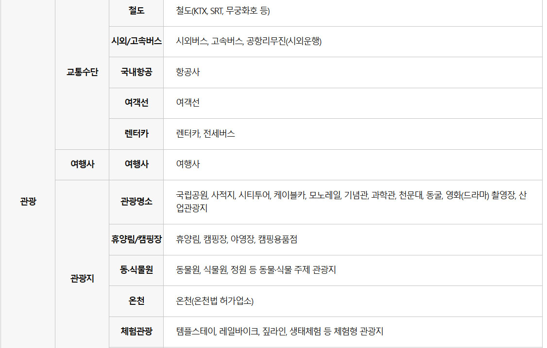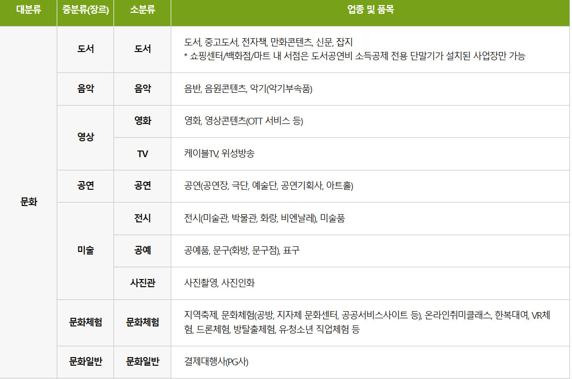 문화 분야에서는 영화관, 서점, 전시·공연, 사진관, 문구점 등이 있고, 관광 분야에서는 테마파크, 철도, 템플스테이, 국립공원 등이 해당된다. 체육 분야에서는 헬스장, 수영장, 볼링장, 필라테스 등에서 사용 가능하다.