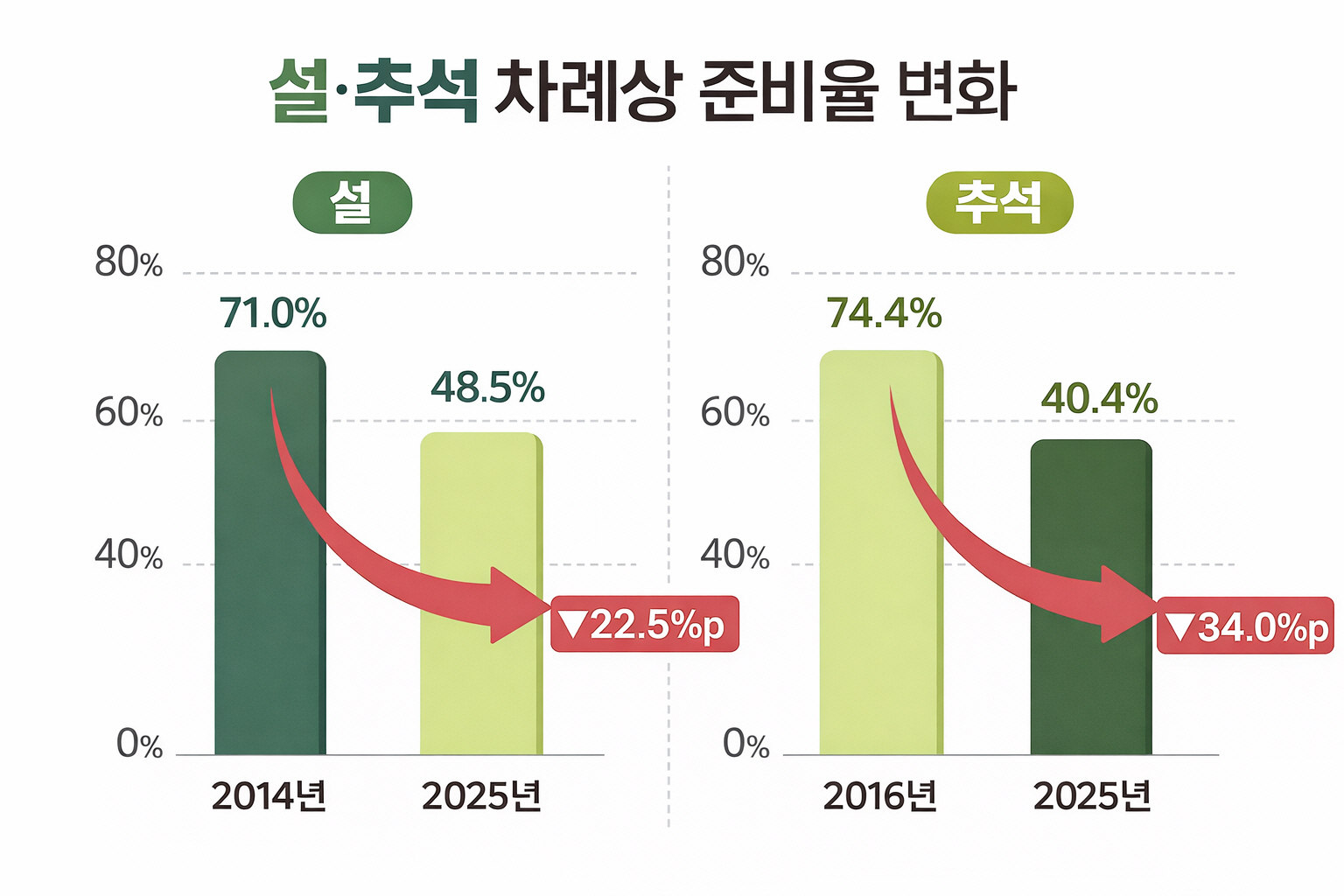 각종 조사 결과는 이러한 변화를 수치로 보여준다. 최근 조사에 따르면 추석에 차례상을 준비하겠다고 답한 가구 비율은 과거에 비해 크게 낮아졌고, 설 명절 역시 비슷한 흐름을 보이고 있다. 불과 10여 년 전만 해도 다수의 가구가 차례를 당연한 의무로 여겼지만, 이제는 절반 이하만이 전통적인 방식의 차례를 유지하겠다고 응답했다. 명절 의례가 ‘해야 하는 일’에서 ‘선택 가능한 일’로 바뀌고 있다는 의미다.