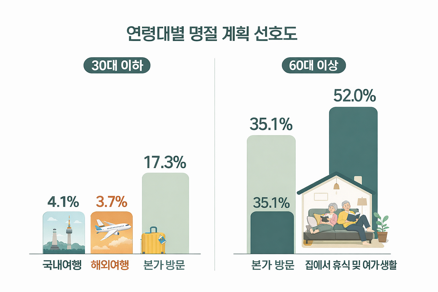 연령대별 차이도 분명하게 나타난다. 30대 이하에서는 명절에 국내여행이나 해외여행을 계획하는 비중이 서로 비슷한 수준으로 나타나며, 명절을 하나의 휴가 기간으로 받아들이는 인식 변화가 빠르게 진행되고 있다. 반면 60대 이상에서는 본가 방문보다 집에서 휴식과 여가를 선택한 비중이 더 높게 나타나, 고령층 역시 명절을 반드시 이동해야 하는 의례적 시간으로만 보지 않음을 보여준다. 명절 인식의 변화는 세대 간 단순 대립이 아니라, 가구 형태와 삶의 단계에 따라 다양하게 나타나고 있다.