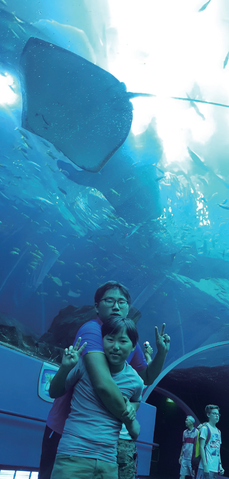 그래서 나는 마치 내가 땅 한 가운데에 있는 실제 바다에 온 느낌이었다.‘바다사자쇼’도 봤다. 이 쇼의 바다사자들은 발을 흔들며 인사도 하고, 춤도 추고, 뒤로도 걷고, 물구나무도 서는 등 다양한 묘기를 부려서 신기했다. ‘돌고래쇼’도 봤다. 이 쇼의 돌고래들은 높이 점프, 서서후진, 사람을 태우고 수영하기 등 온갖 묘기를 부려서 재미있었다. 게다가 떠나면서도 갓 묘기를 부려서 더더욱 신기하였다. 그래서 우리는 떠나면서 조련사를 배경으로 사진도 찍었다. ‘열대지역 잠수부’관에도 가봤는데, 그곳은 뿔복과 해파리, 말미잘, 흰동가리 등이 있었다.