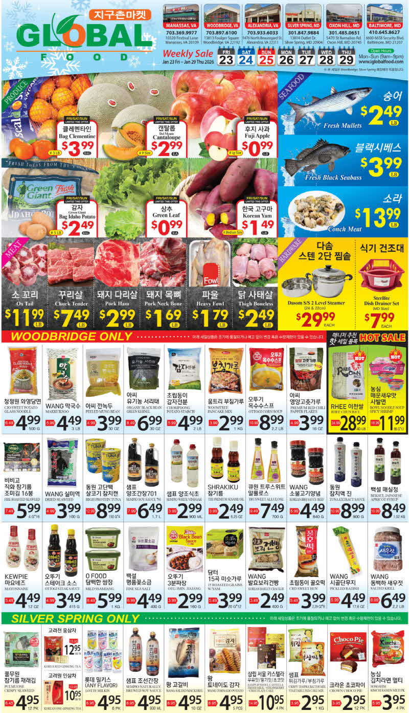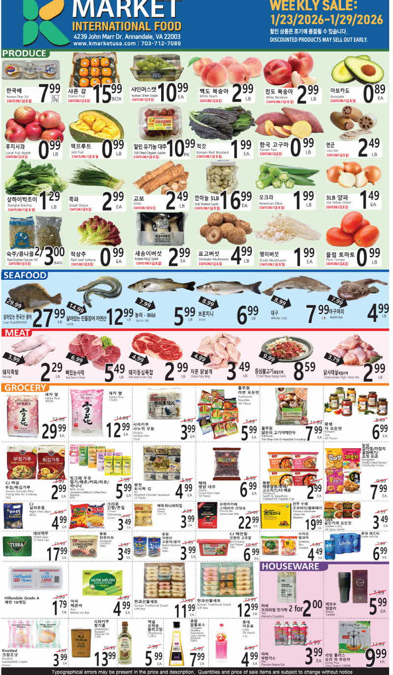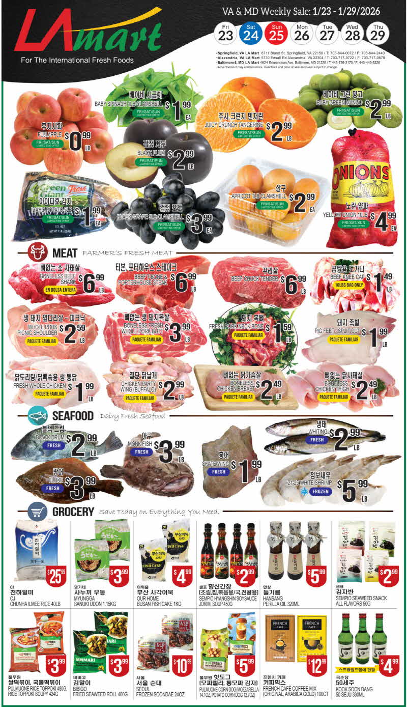 K MARKET / LAMART / GLOBAL / NEW GRAND 사과 $0.99~$1.29 고구마 $0.99~$1.49 배추 $0.99 양파 $1.49 감자 $2.99 돼지목뼈 $1.69~$1.99 삼겹살 $2.59~$4.79 새우 $4.99~$5.99 고등어 $3.99~$7.99