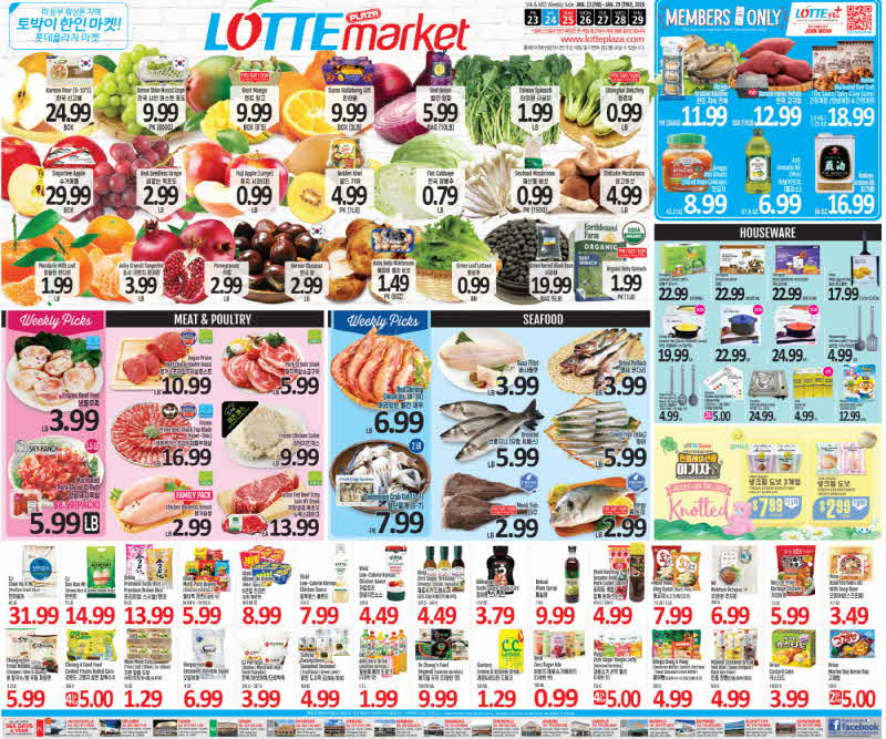 LOTTE PLAZA 사과 $0.99/lb 배추 $0.79/lb 청경채 $0.99/lb 양배추 $0.79/lb 새송이 $0.99 팽이 $1.99 삼겹살 $5.99/lb 소불고기 $10.99/lb 냉동새우 $7.99 김치 $8.99