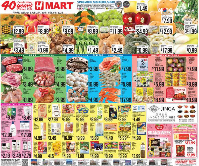 수산/육류: 새우 $6.99/lb, 오징어 $3.99/lb, 불고기 $11.99/lb