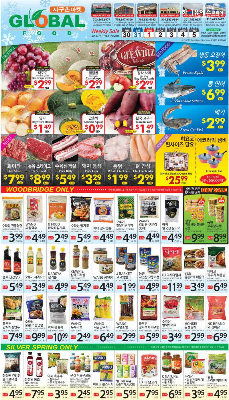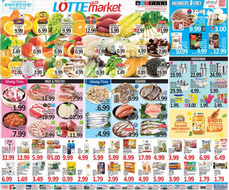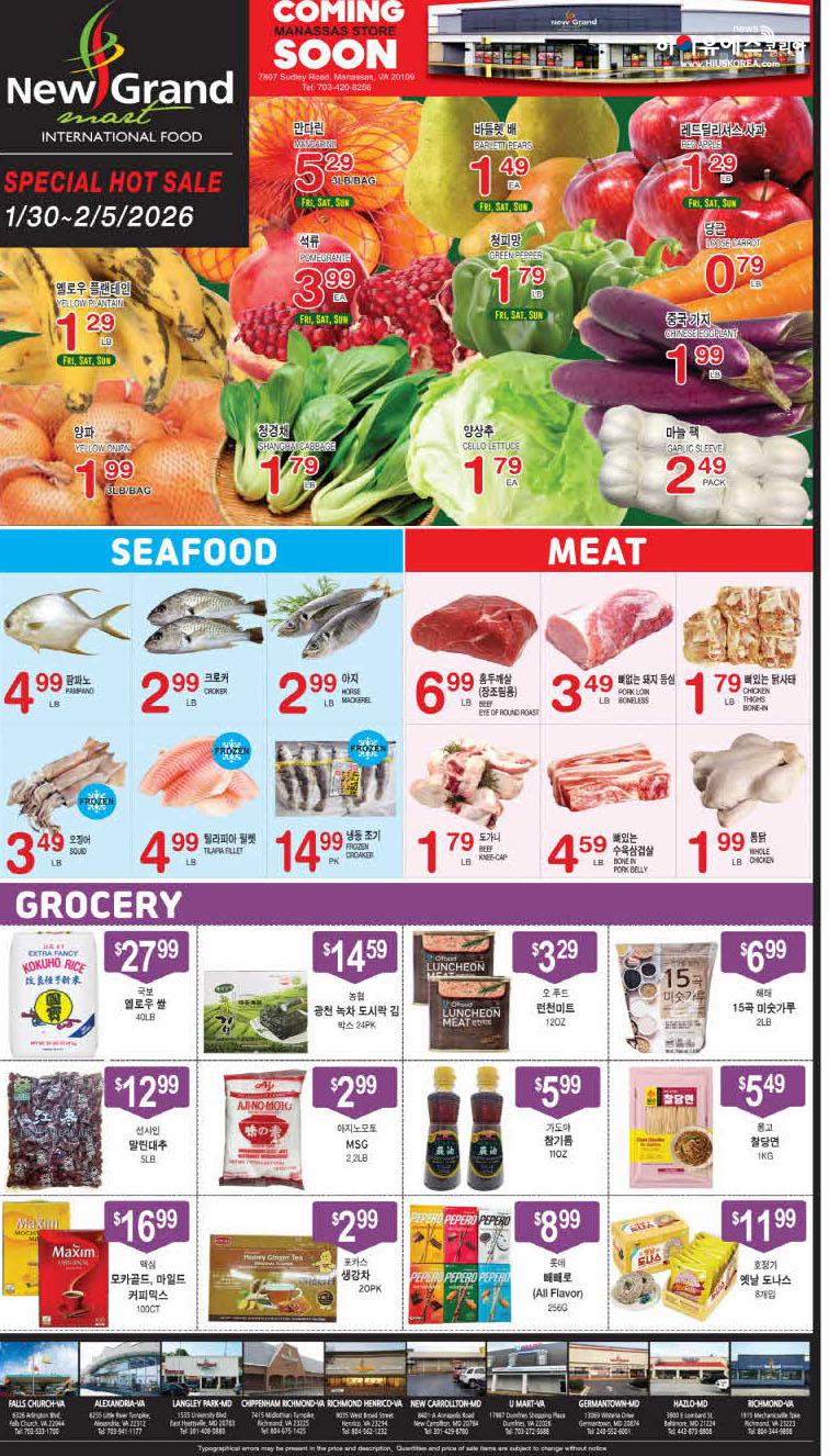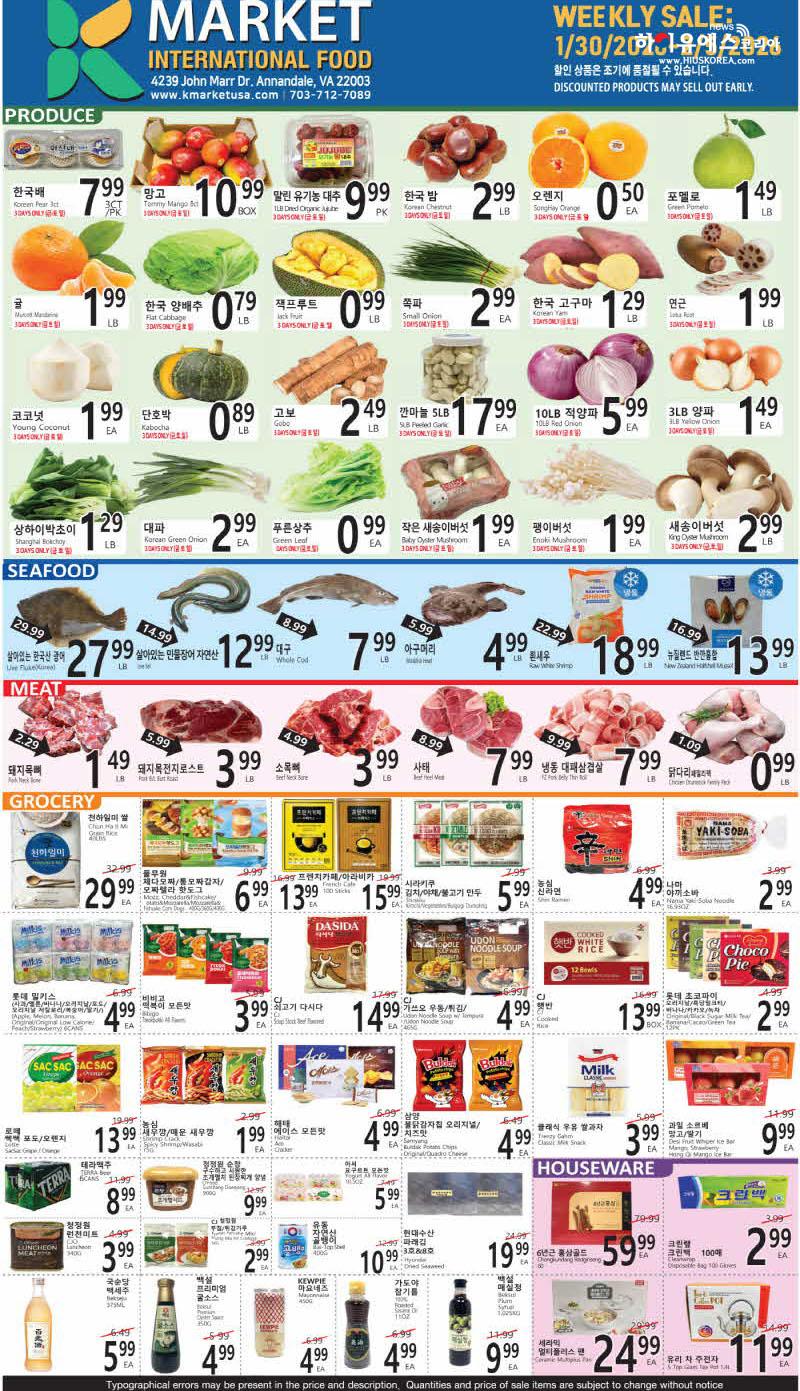 수산/육류: 대구 $7.99/lb, 흰새우 $4.99/lb, 돼지목뼈 $1.49/lb